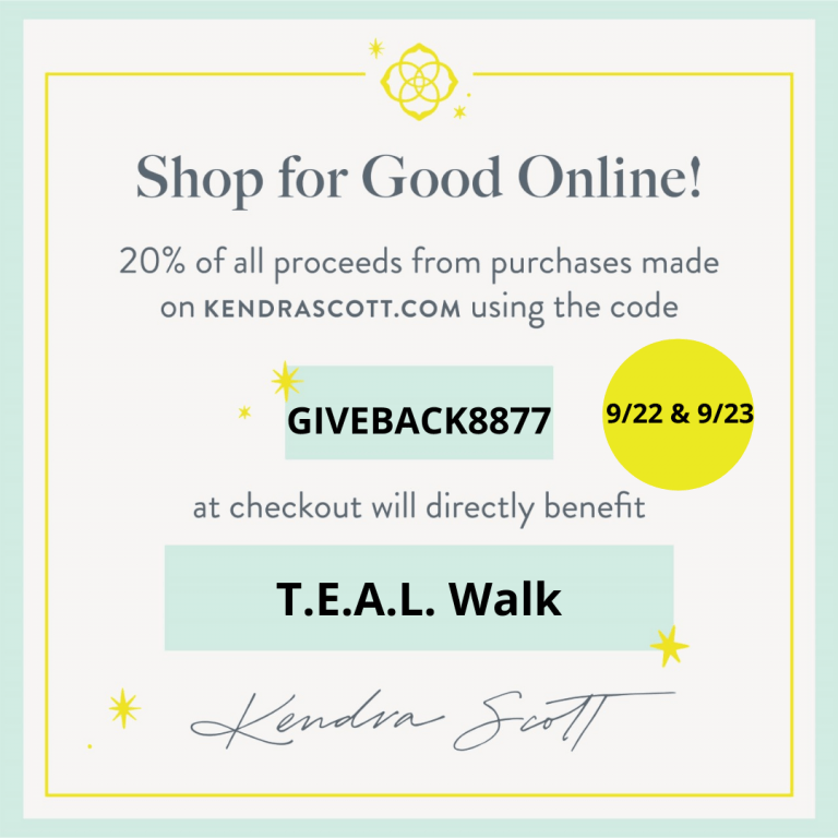 Kendra Scott held another online fundraiser for Tell Every Amazing Lady® on September 22nd and 23rd, 2020 in honor of National Ovarian Cancer Awareness Month. Online shoppers could use a code at checkout on the site, and the NYC Soho store would donate 20% of all proceeds to T.E.A.L.®. This was a two-day online shopping event. Earlier in the year, Kendra Scott also donated beautiful teal colored jewelry to our Amazing Lady Membership Program for ovarian cancer survivors in the program.