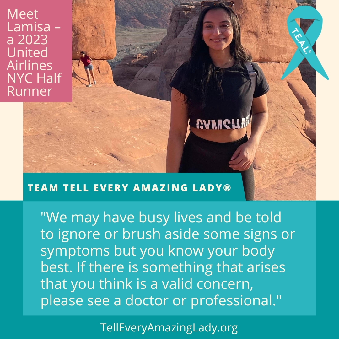 You can help Lamisa reach her fundraising goal for the 2023 United Airlines NYC Half here. All donations go to Tell Every Amazing Lady® and help with the fight against ovarian cancer.