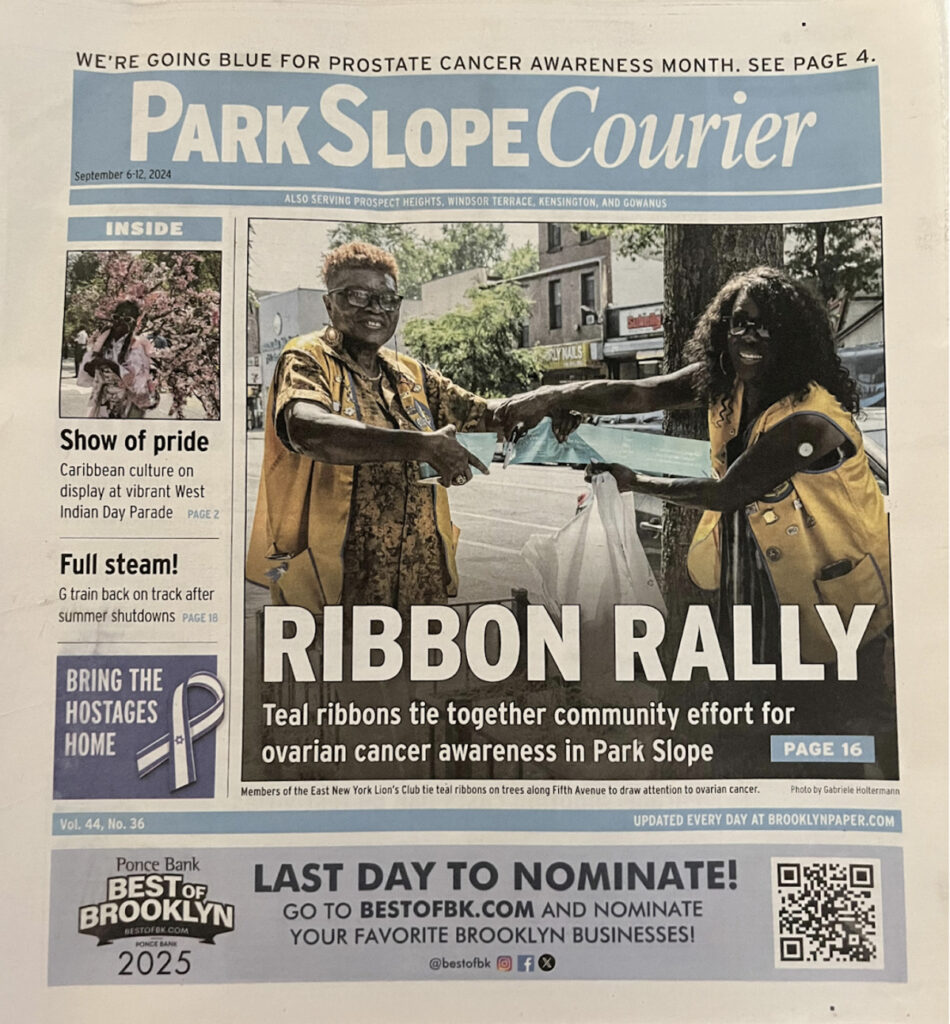 Check out this article by the Brooklyn Paper showing how the District 20-K1 Lions Club of Brooklyn helped us Turn The Town’s Teal® on 5th Ave and North Flatbush Ave in Brooklyn to raise awareness for ovarian cancer.