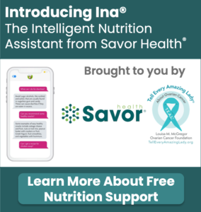 T.E.A.L.® has partnered with Savor HealthⓇ to bring personalized nutrition support to help people with cancer eat healthy and stay well nourished throughout treatment and beyond. Good nutrition can help people with cancer feel better and manage symptoms like diarrhea, nausea, tiredness, and decreased appetite. Simply text InaⓇ from your cell phone 24/7 and she’ll respond with personalized nutrition tips, recipes, and answers to your questions. Knowledge and advice from InaⓇ comes from registered dietitians, nurses, and doctors who are experts in treating and supporting cancer patients. Registration and unlimited 24/7 access to InaⓇ is free, safe, and secure